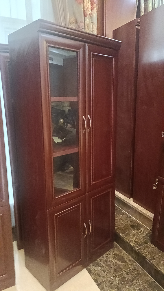 二門書柜,上下分體門結(jié)構(gòu),上書柜左邊為玻璃門,門內(nèi)有2層隔板,用于放置文件書籍等,上書柜右邊為木質(zhì)門板,內(nèi)有掛衣桿,用于放置外套等衣物。下書柜為木質(zhì)門板,內(nèi)有一層隔板。