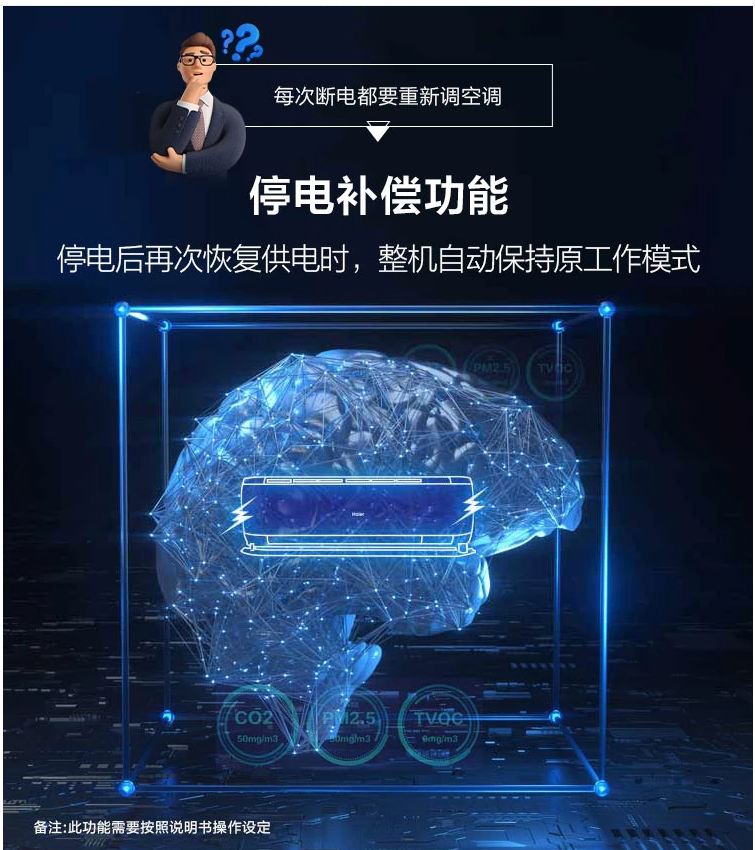 海爾節(jié)能風空調(diào),內(nèi)外機自清潔,可深度清洗蒸發(fā)機中的灰塵,更有一鍵自清潔功能,保障空氣健康,為您的呼吸保駕護航;出風更潔凈;一鍵PMV,舒適節(jié)能一舉兩得,一鍵開啟,空調(diào)自動進入制冷/制熱熱模式,達到人體舒適溫度;停電后再次恢復供電時,整機自動保持原工作模式;還帶有一鍵開啟除濕功能,全屋清爽,告別悶熱。